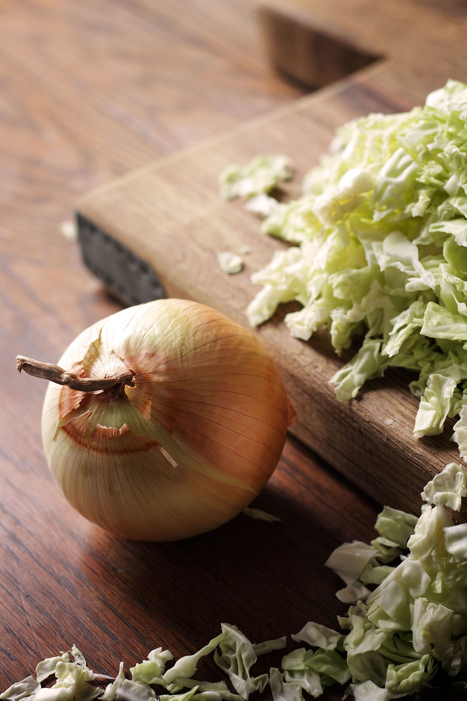 1. Cook the cabbage and onion in butter over medium-high until softened. A large wok works best. Season the cabbage with salt and pepper as you work (if it's bland now, it'll be bland later!). The wilting process takes about 20 minutes. You may need to reduce the heat as you go to prevent burning. Stir occasionally.