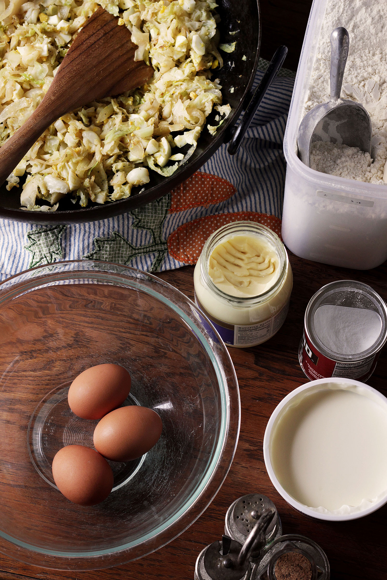 … second, season generously with salt and pepper (a little extra pepper adds welcome bite). Think of this way: scrambled eggs without a good shake of salt and pepper are terrible. The same goes with cabbage pie, especially since there’s a few hard-boiled eggs in the mix.