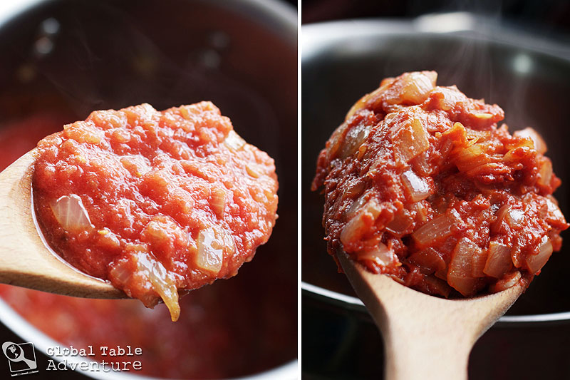 Next, add the tomato sauce and reduce until thick and pasty. You’ll know when it’s ready when a wooden spoon drawn through the mixture leaves a distinct line.
