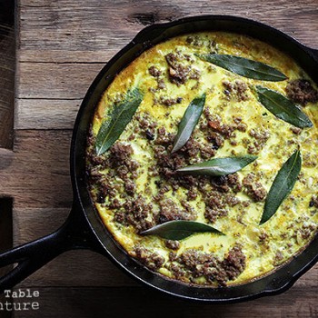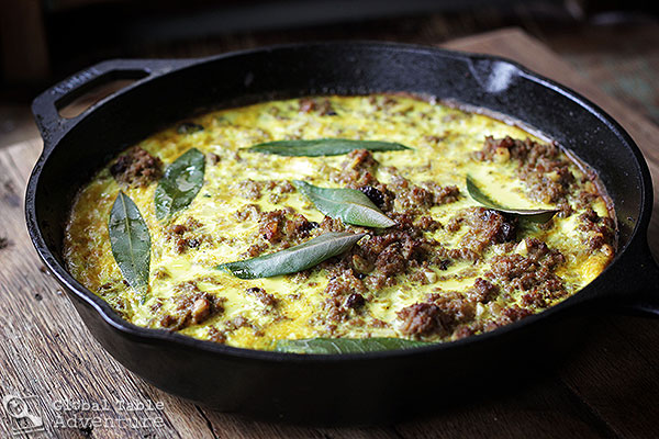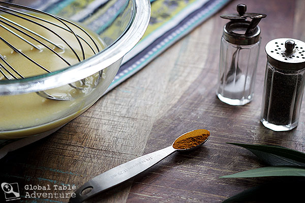 Once you’re happy with the flavor, prepare the custard. Simply whisk the eggs into the reserved milk with a bit of turmeric, salt,and pepper. Pour over the meat mixture.