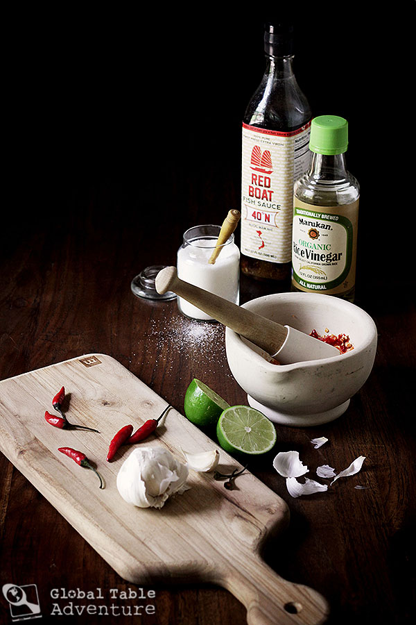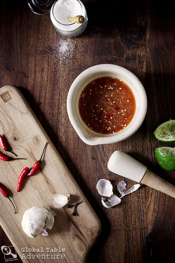 First, prepare the dressing. I like to use a mortar and pestle to grind the peppers and garlic with the sugar. Then I add the remaining ingredients and adjust the flavors to taste. Alternatively, you could just slice the peppers in tiny rings and crush the garlic.