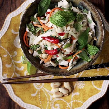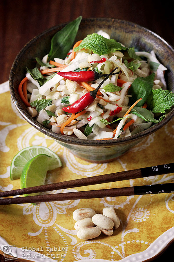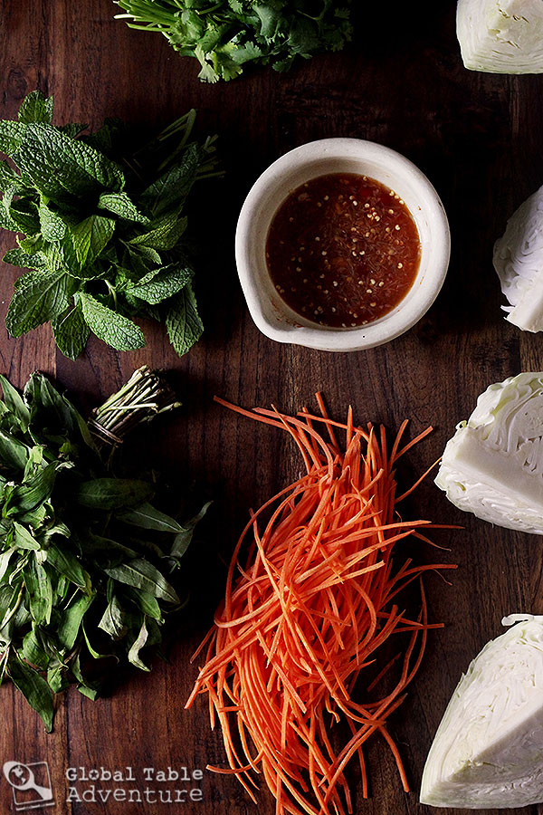 The salad is a simple affair, really – commonly served on the side of many Vietnamese meals: cabbage and carrots tossed with fresh herbs, crushed peanuts, and a Nước mắm pha-style dressing. It’s at once spicy and fresh. Bold, yet healthy.