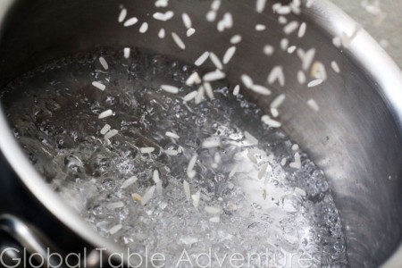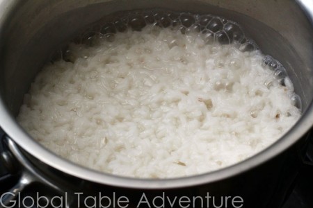 - Boil water. Add rice and simmer uncovered for 15 minutes.
