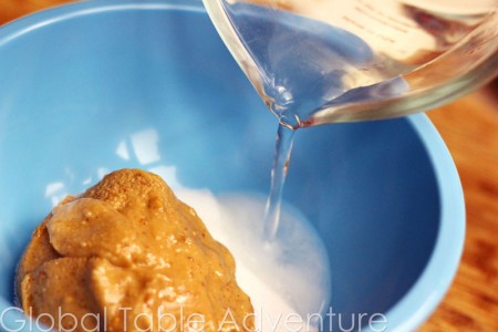 - Meanwhile, mix together peanut butter, sugar, and 1/8 cup water.