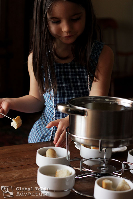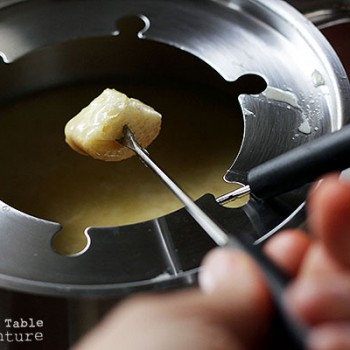 For starters, rub a small, heavy bottomed pot with the cut end of raw garlic. This will help infuse the faint aroma of garlic into the fondue, making the whole pot sing.