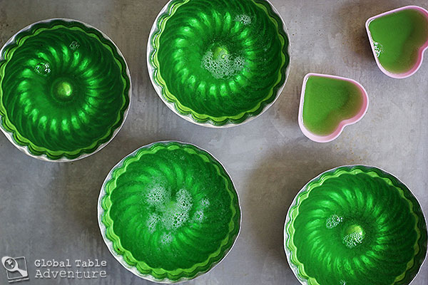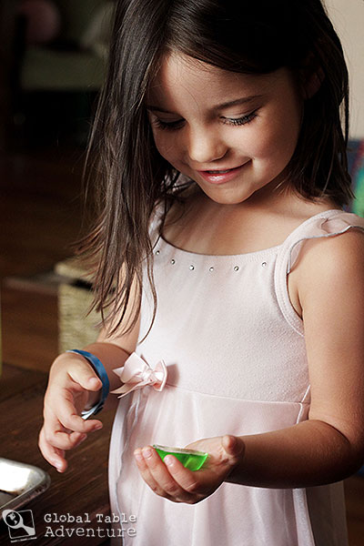 I used pandan flavored jelly from Nam Hai, one of our local Asian markets. They also had mango, lychee, and many other fun, tropical flavors. (Note: You might find it easier for dicing to make your jello in a 9×9 container – but Ava and I had a blast using these molds)