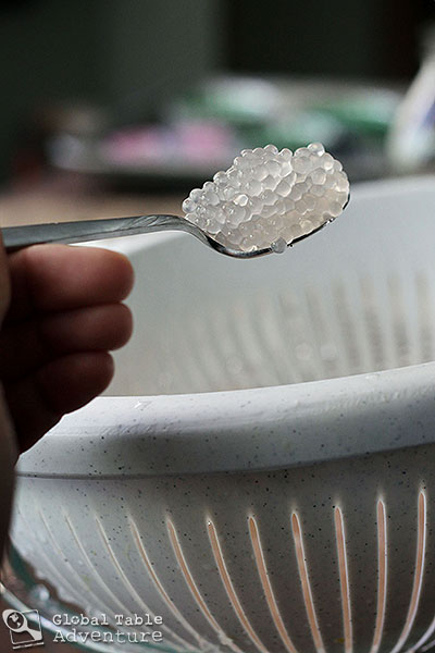 When the tapioca look like millions of fish eggs, drain and rinse thoroughly with cold water until the tapioca itself is completely cool.
