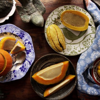 Whether you use a squash or a pumpkin, Sankaya eats like a deconstructed pumpkin pie. The center of the gourd is filled with coconut custard, rich with egg and vanilla extract. As the steam heats the custard, the palm sugar and coconut milk butters the gourd’s tender, orange flesh from the inside. But unlike chilled pie, Sankaya is at it’s best a few clicks above room temperature.