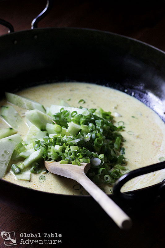 Next, stir in the coconut milk. Pile on the green onion and cucumber.