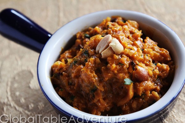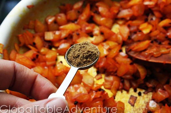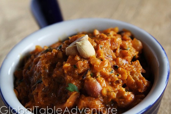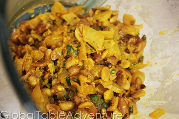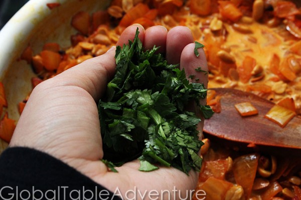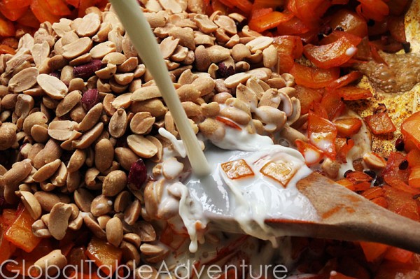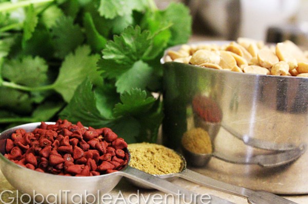 2. Fry your onions in the stained oil until soft and caramelized. Add the cumin, unsalted peanuts and milk. Bring to a simmer and cook for five minutes. Then toss in a handful of coarsely chopped cilantro.