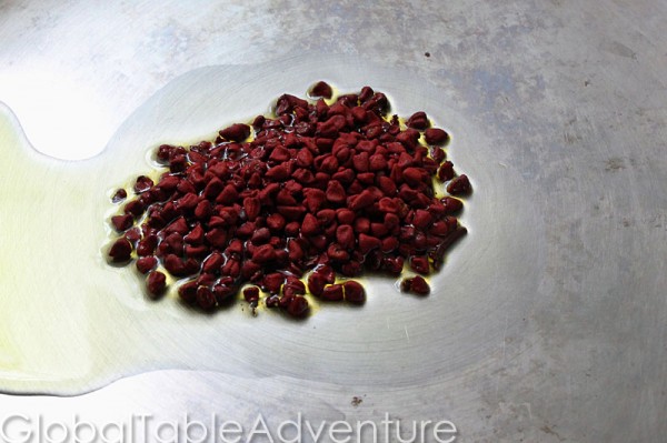 1. Heat a tablespoon or two of oil in a medium skillet. Add annato and cook until the oil is stained red. Now.. this is very important… REMOVE the annato from the oil.
