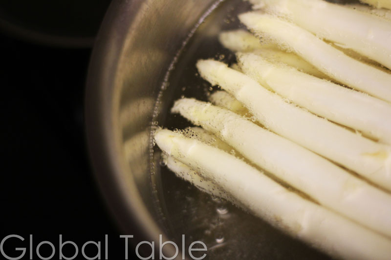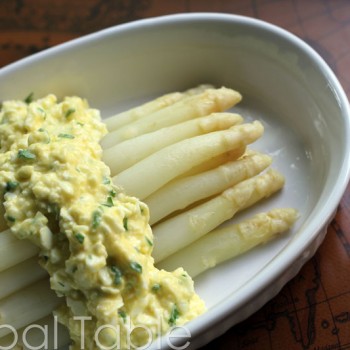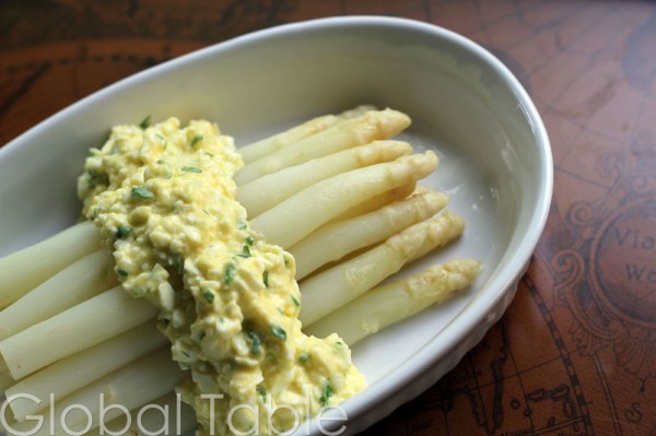 White asparagus tastes more mild than green asparagus, perhaps even a little sweeter. The topping is rather like a rich, lemony egg salad and goes well with the asparagus.