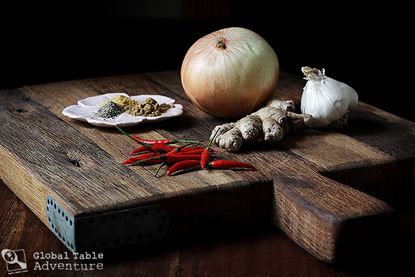 - When softened, add on the garlic, ginger, chilies, cumin, mustard seeds, and pepper. Cook a few more minutes, until fragrant.