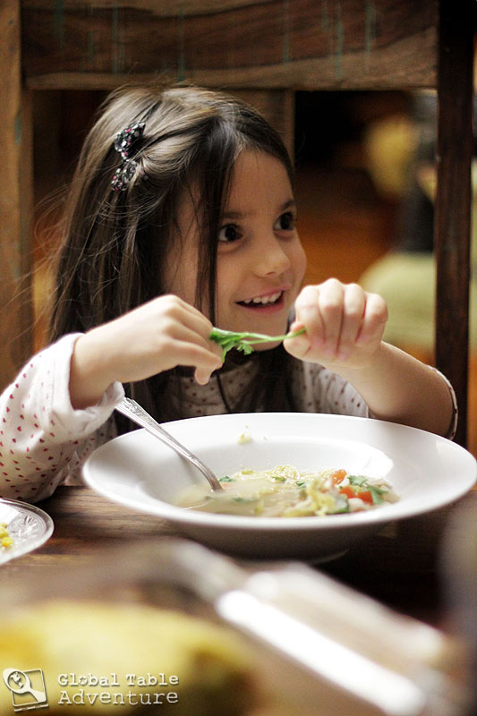 Children will especially enjoy squeezing lime juice on their soup and sprinkling their bowl with parsley. Adults will enjoy seeing how many Thai Bird chili peppers they can handle. My husband added an entire sliced chili to his bowl; though he was sniffling and coughing from the heat, he then proceeded to add more.