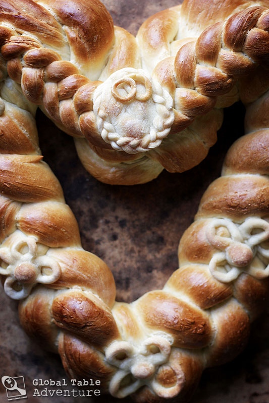 We are closing in on spring … that special time of year, when weddings and baby showers sprinkle our calendars, and everything is awash in the promise of new love. In Slovenia, such times are marked with Pleteno Scre – an ornamental, braided, tender loaf of bread, shaped into a heart. Pleteno Scre is an honored gift. The slightly sweet loaves are painstakingly decorated with edible tokens, like wedding rings and flowers (as I have done), or even astonishingly detailed birds, or paper thin leaves that seem to crackle under the slightest breeze. This art form takes time to master, so I stuck with simple flowers, a wreath, and rings. The best part is that this is something you can do as a family. Little ones love to have a piece of dough to play with. Mashing and rolling, twisting and turning – it’s what they do best. Ava didn’t even want to make any shapes for the heart – she just wanted to play next to me, while I worked. It was sweet. And …